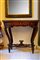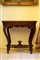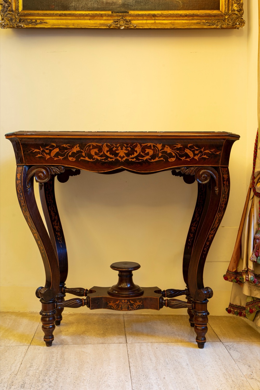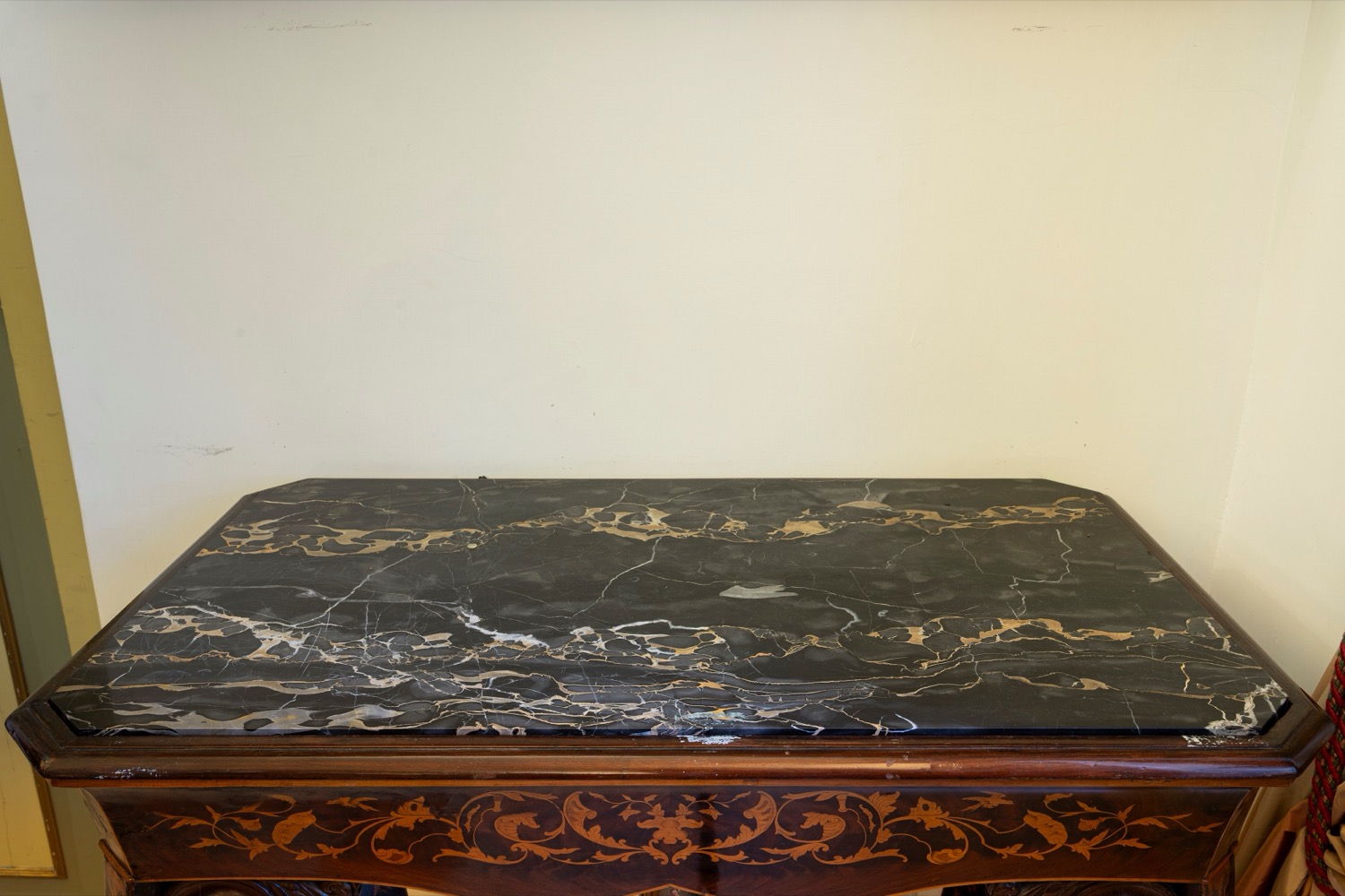 Lot 184 | Coppia di consoles Carlo X lastronate in mogano e intarsiate a motivo floreale con piano in marmo portoro incassato. Francia, secolo XIX
