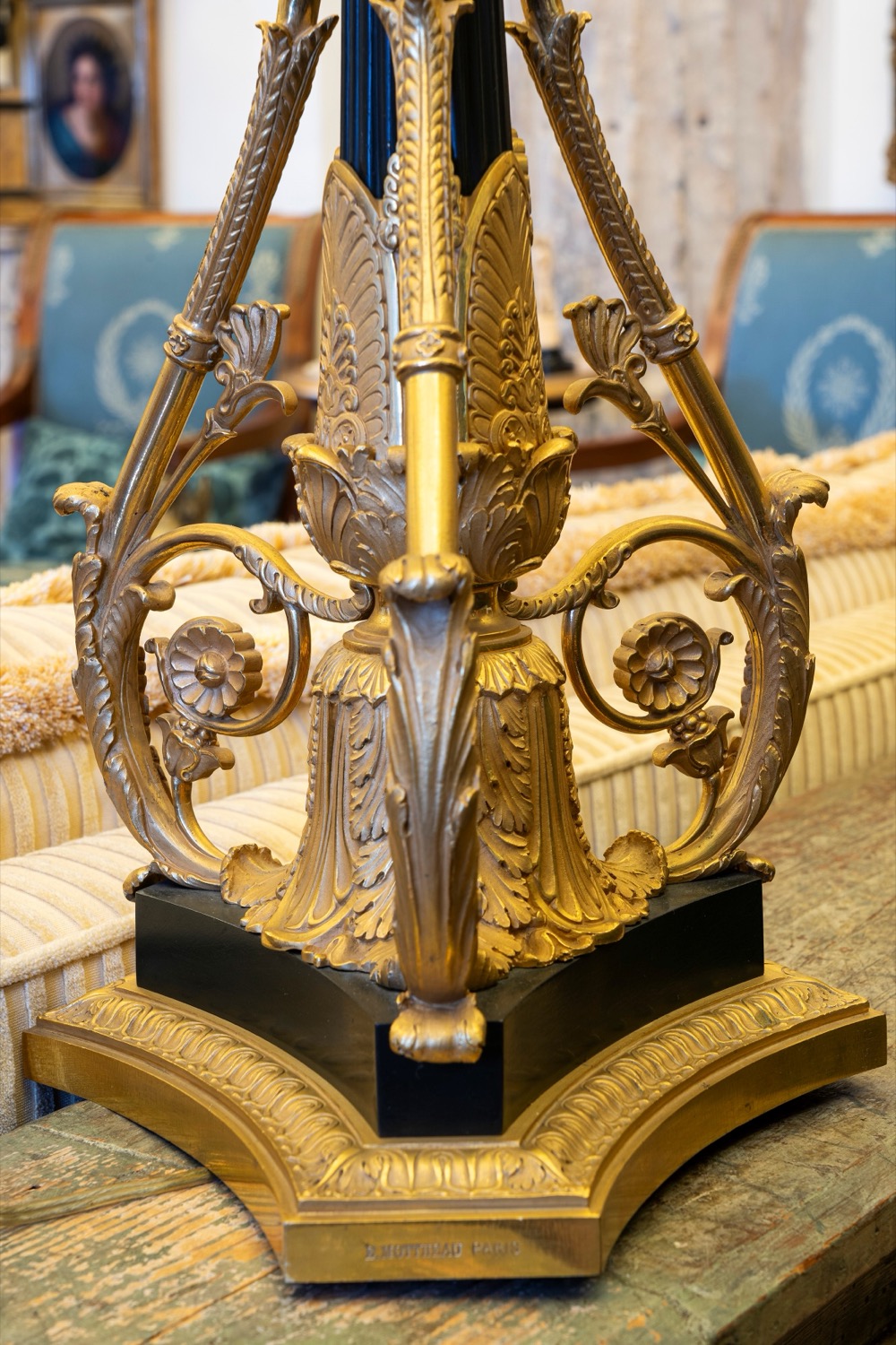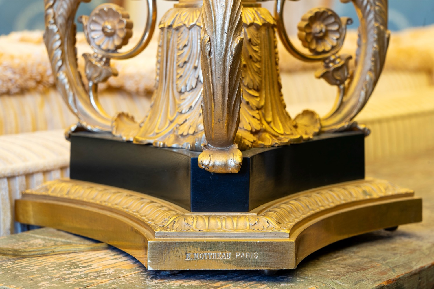 Firmati E. Mottheau Paris. a fusto scanalato su base sagomata, montanti e bracci a girali di volute fogliate e teste d'aquila.