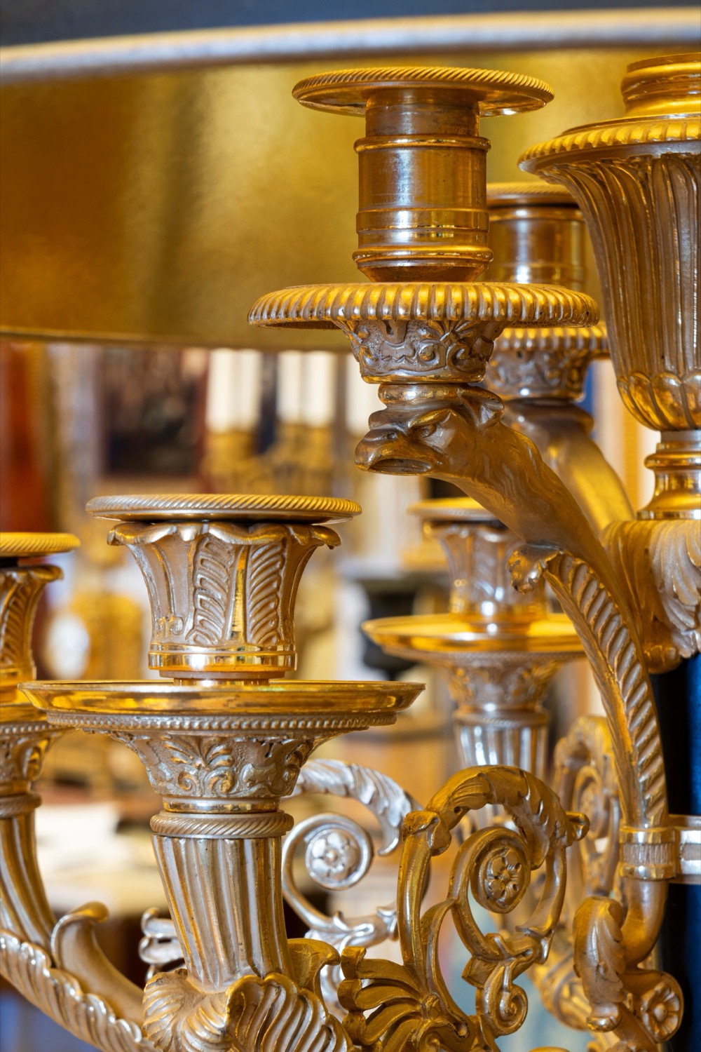 a fusto scanalato su base sagomata, montanti e bracci a girali di volute fogliate e teste d'aquila.