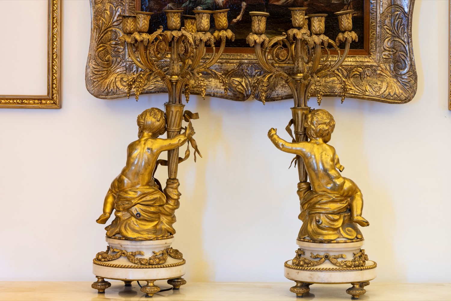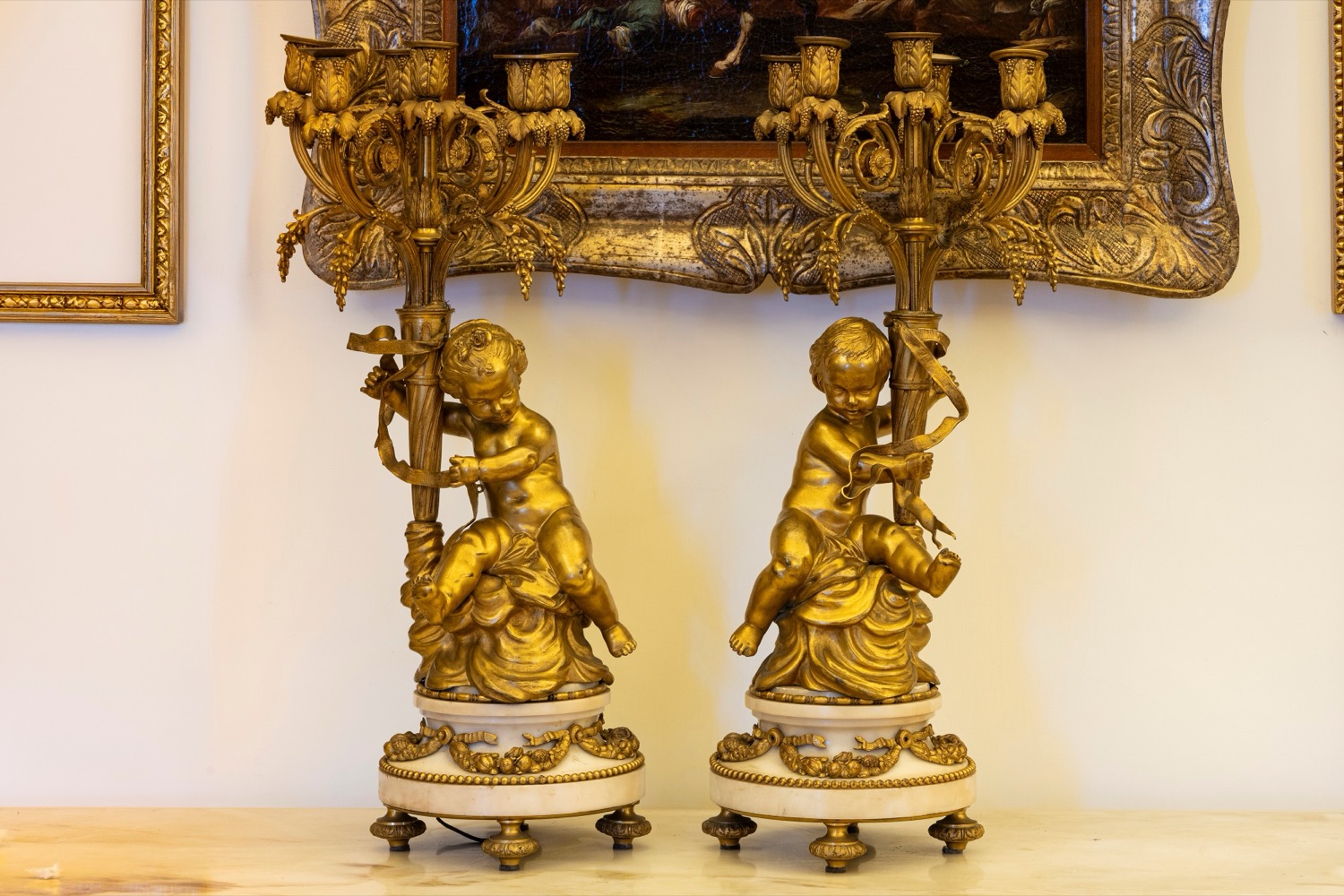 Coppia di candelabri a sei luci in bronzo e marmo bianco con sostegno a putti. Francia, fine secolo XIX