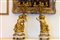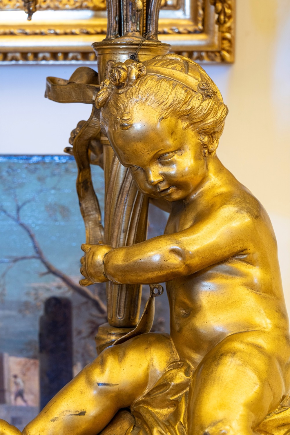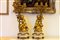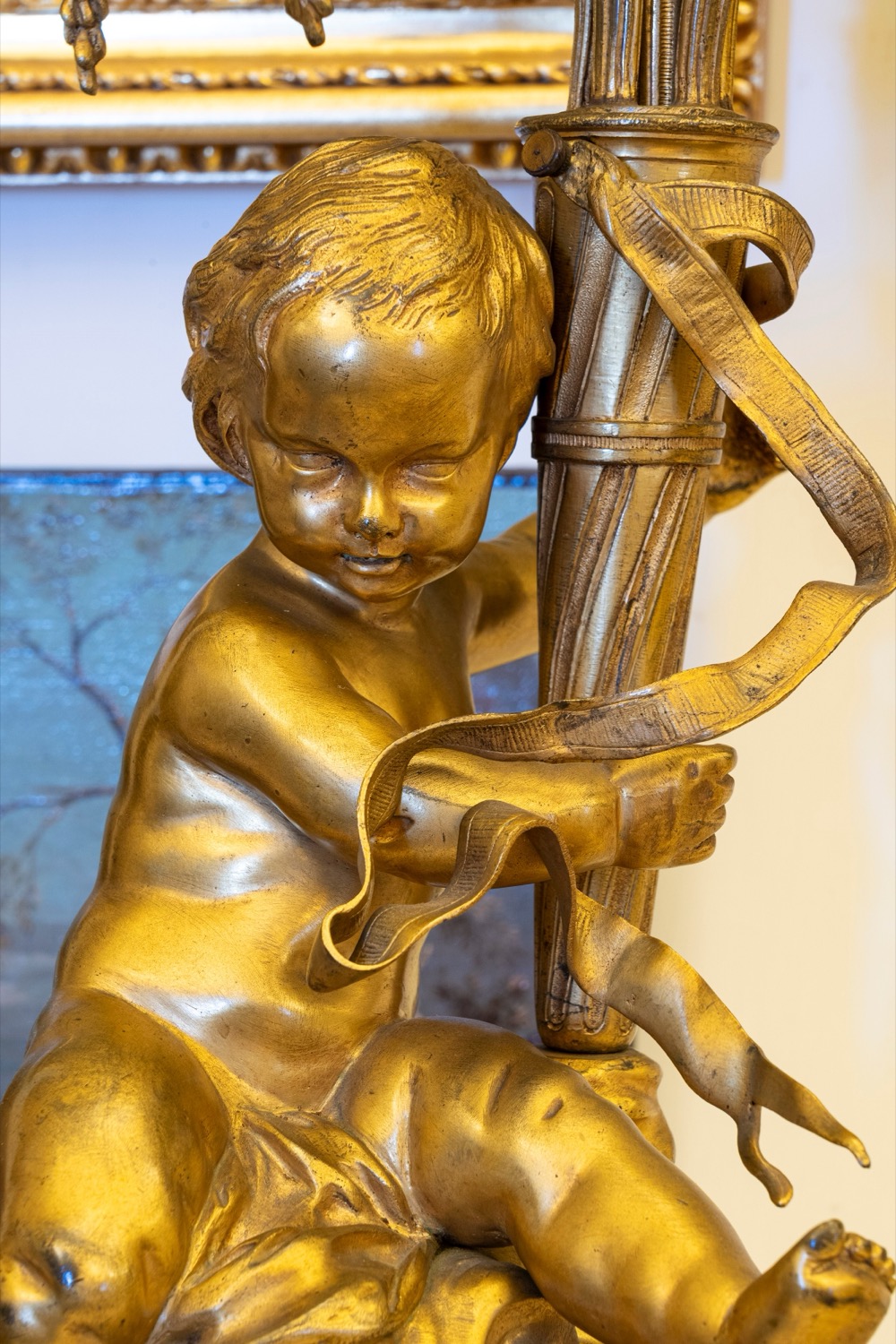 Basi circolari su piedini a trottola con festoni su cui poggiano i putti che sostengono gli steli da cui si diramano i girali di foglie e fiori dei candelabri. Basi circolari su piedini a trottola con festoni su cui poggiano i putti che sostengono gli steli da cui si diramano i girali di foglie e fiori dei candelabri.
