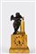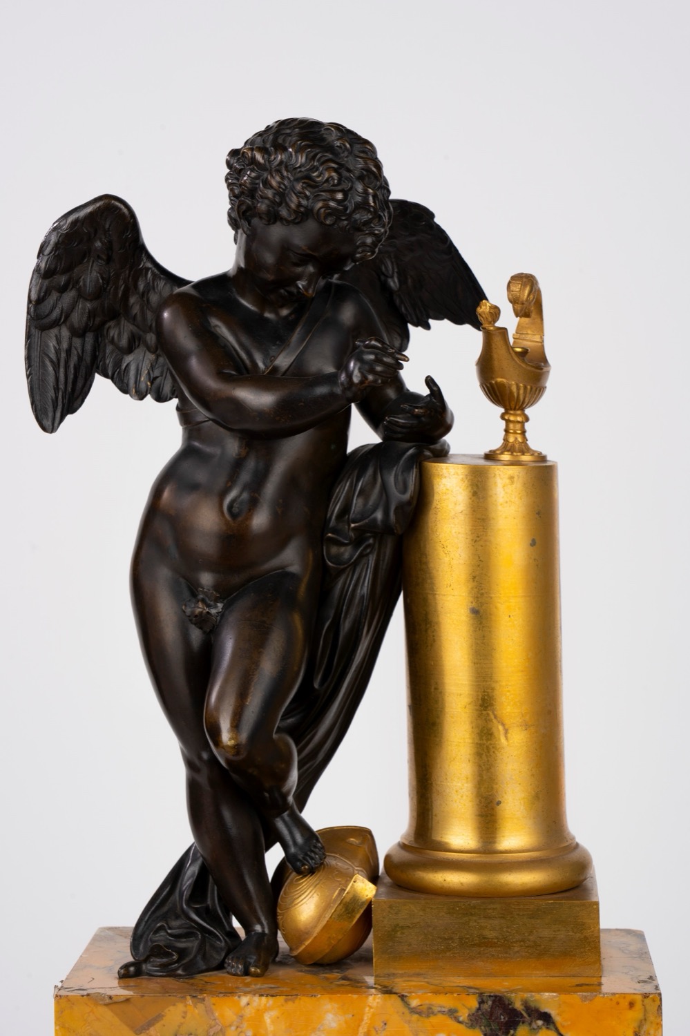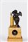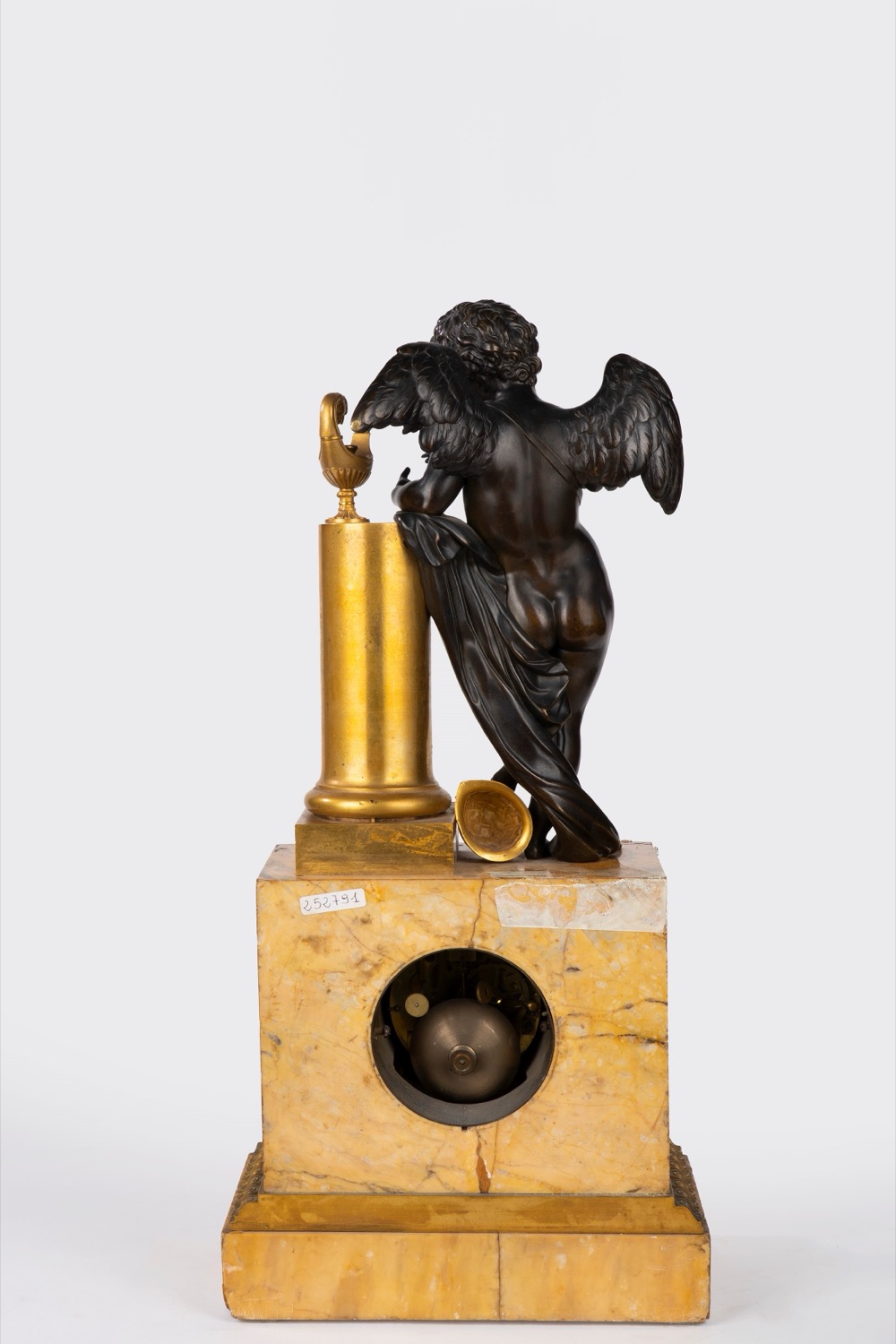 Orologio da appoggio in marmo giallo di Siena, bronzo dorato e patinato sormontato da Cupido. Francia, secolo XIX