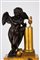 Difetti. Base a plinto con quadrante a cifre romane e lancette traforate, sormontata da Cupido stante accanto ad una colonna cilindrica.