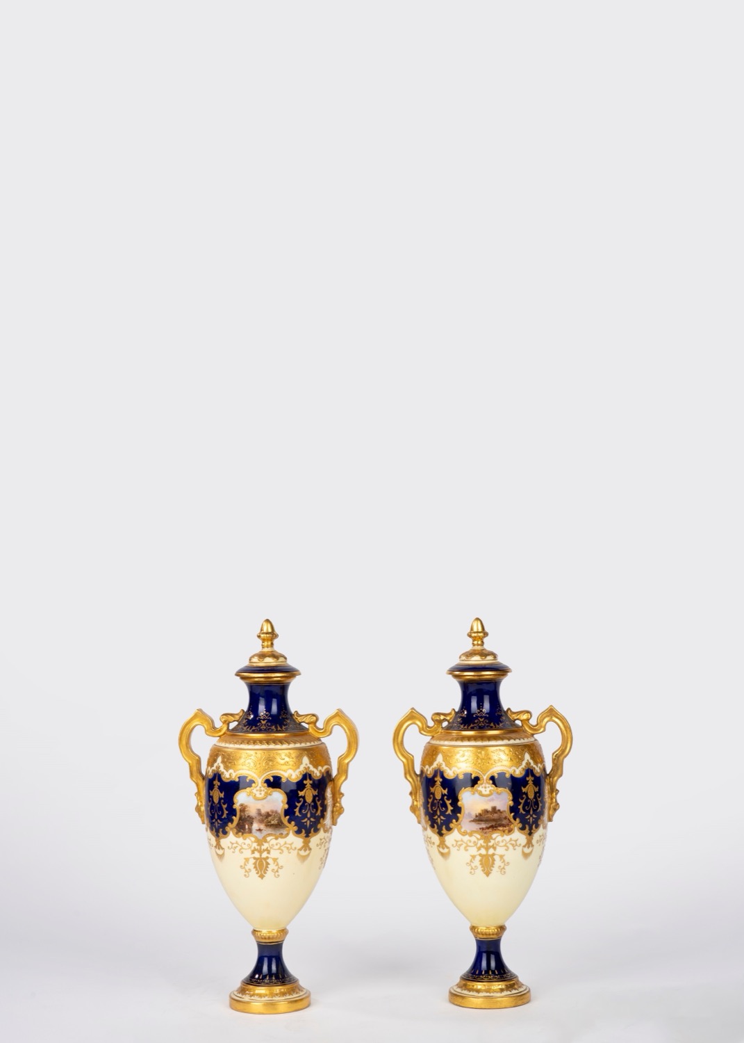Ciascuno con corpo a balaustro con anse mosse, finemente decorato a paesaggio con castelli entro riserva dorata a cartouche con volute fogliate. Poggianti su piedi circolari.