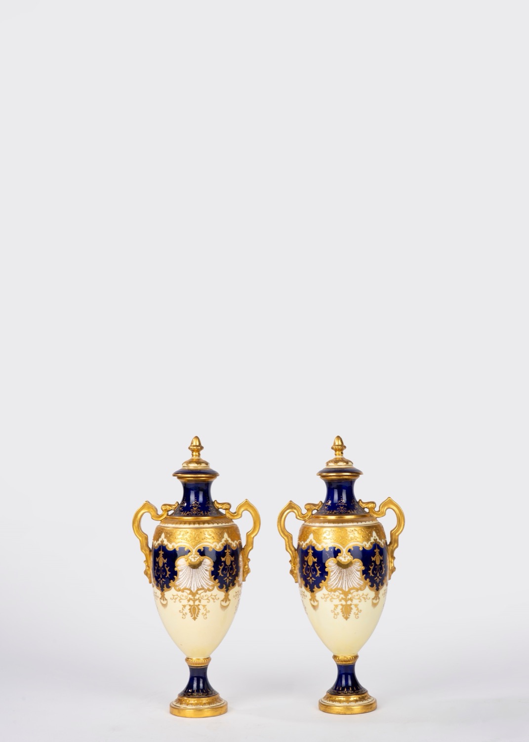 Coppia di vasi con coperchio in porcellana a fondo giallo e blu cobalto. Coalport, fine secolo XIX-inizi secolo XX
