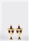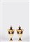 Ciascuno con corpo a balaustro con anse mosse, finemente decorato a paesaggio con castelli entro riserva dorata a cartouche con volute fogliate. Poggianti su piedi circolari. Marca corona in verde, n. 304608 R in verde, C 122 in rosso ferro e oro, V 5686/160.