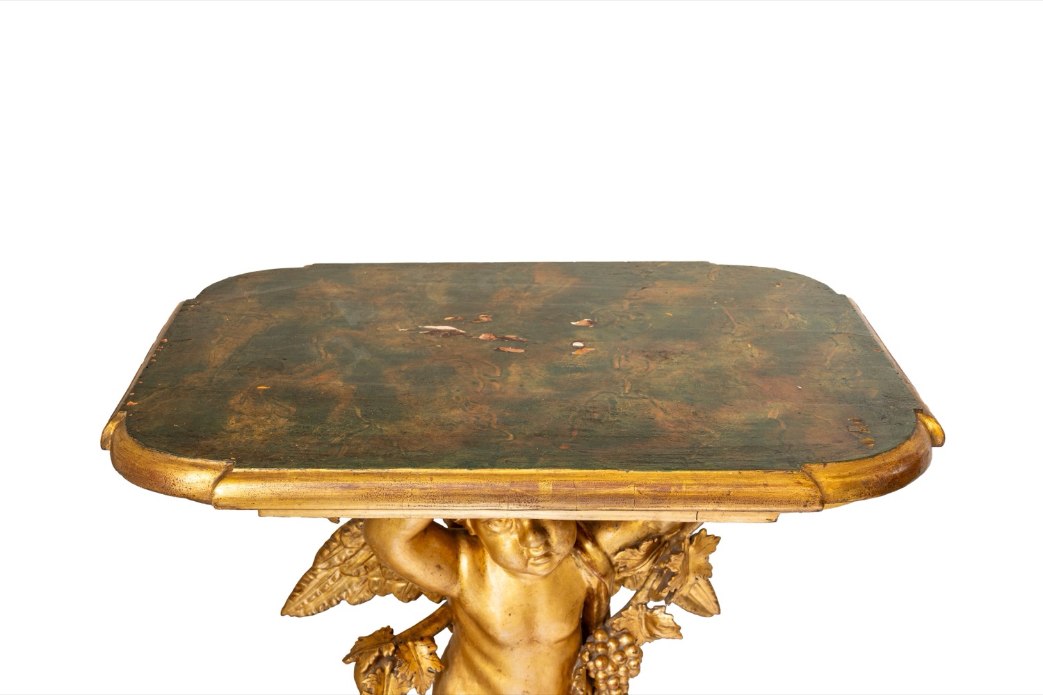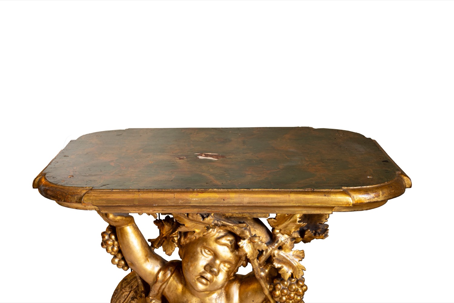 Coppia di consoles in legno scolpito e dorato con piano laccato a finto marmo. Secolo XVIII/XIX