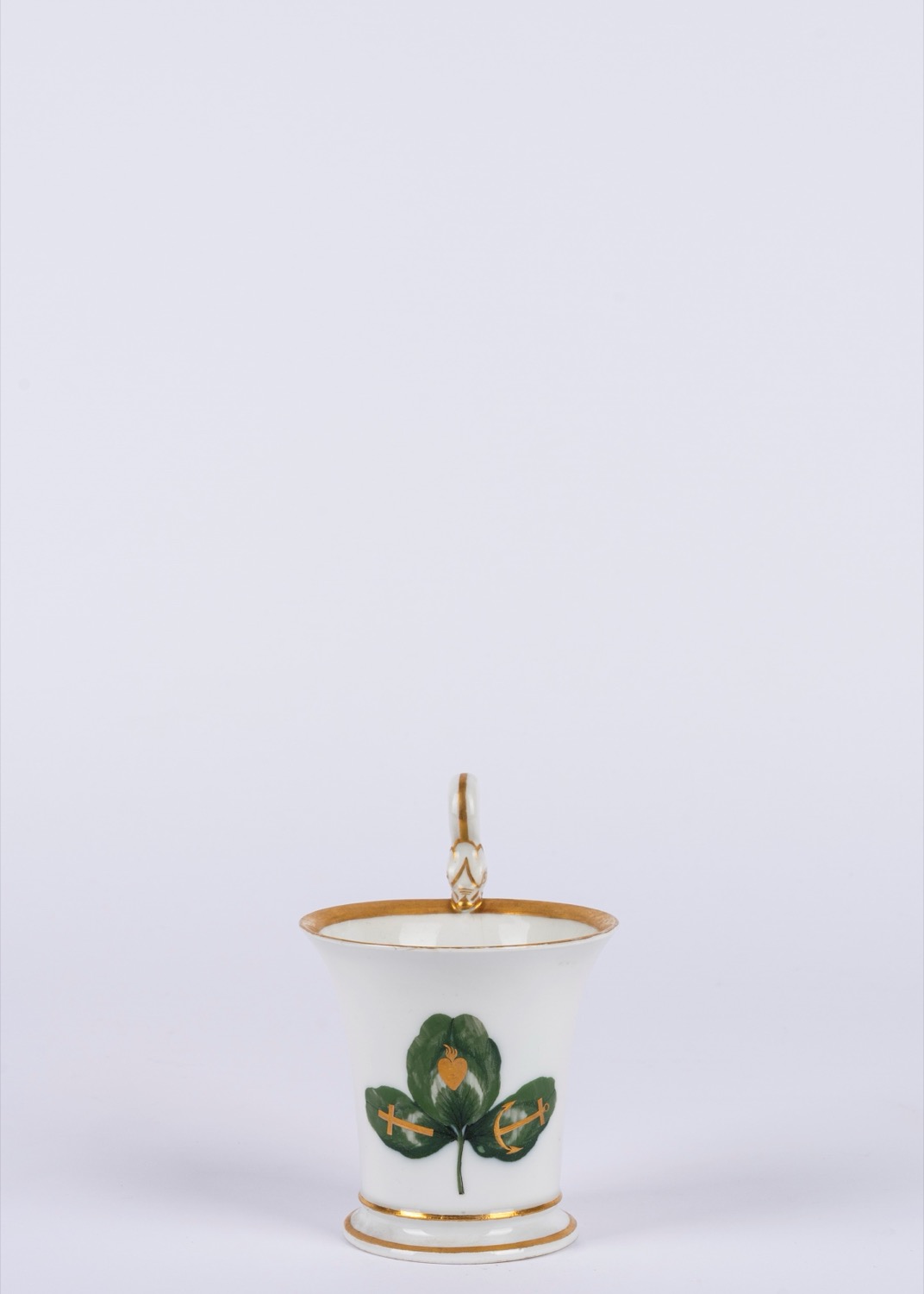 Mancante del piattino.Sul lato frontale è raffigurato un trifoglio con i simboli della croce (redenzione dei peccati e resurrezione), del cuore fiammeggiante (amore di Dio) e dell’ancora (speranza).