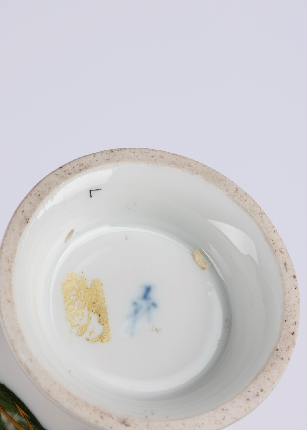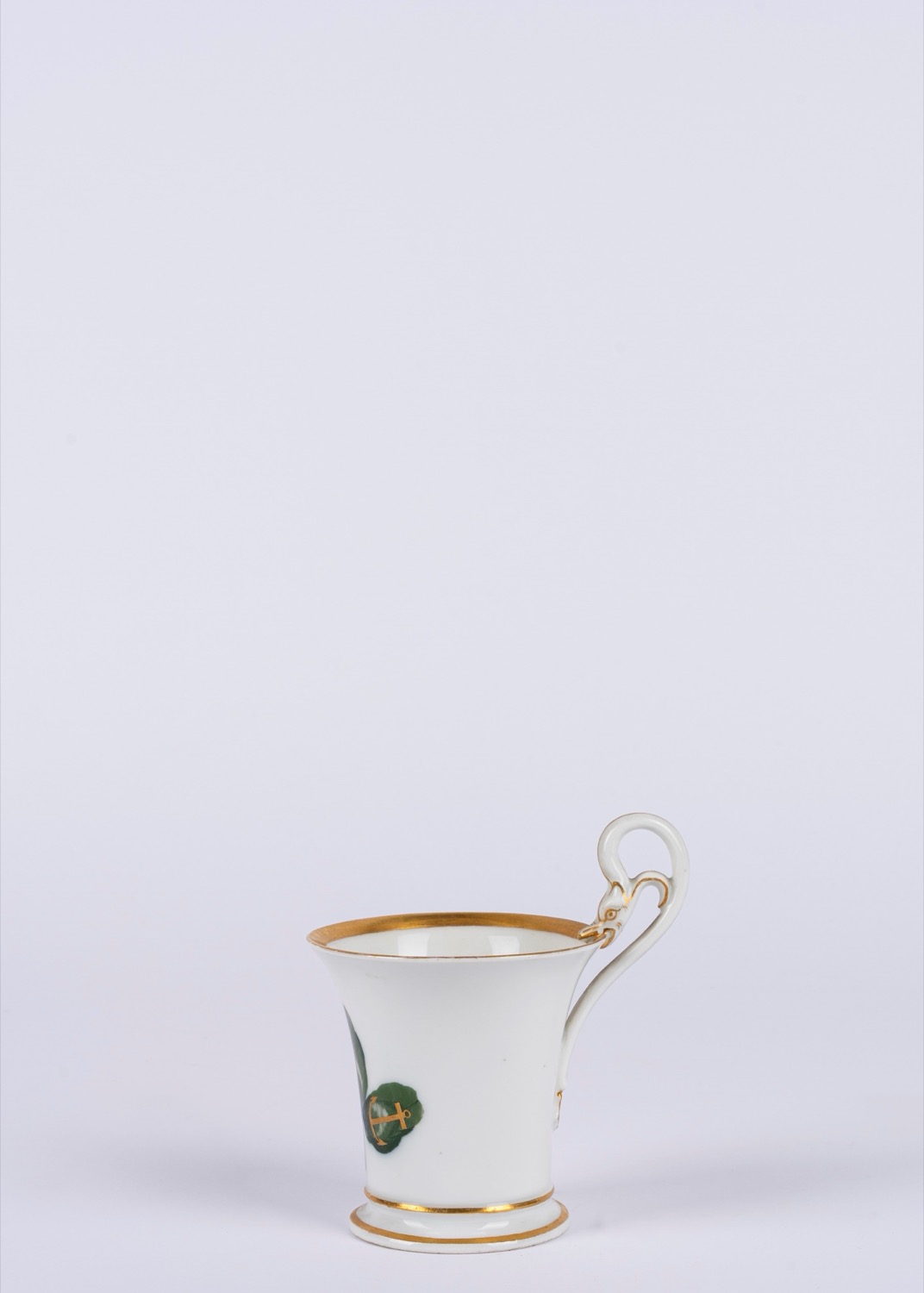 Tazzina in porcellana policroma e dorata di forma svasata con ansa a cigno. Manifattura di Meissen, secolo XIX.