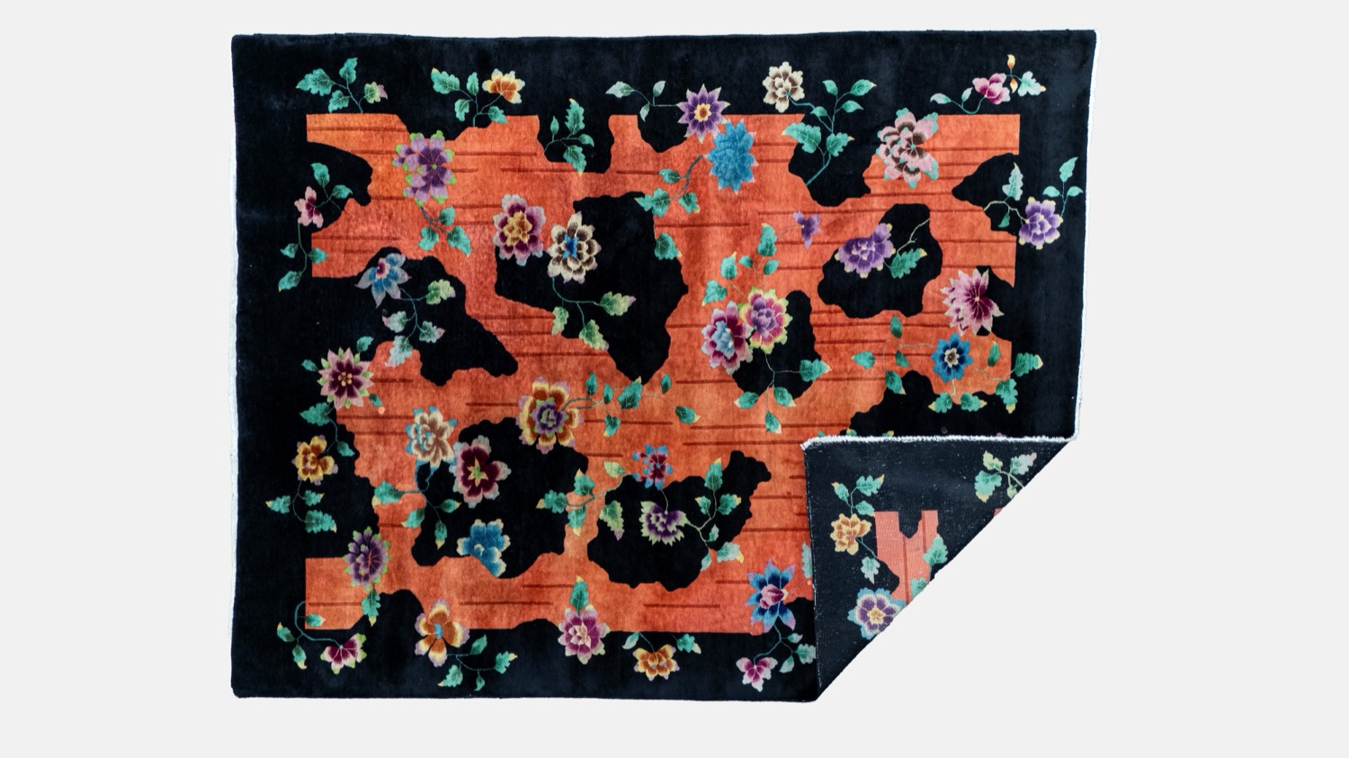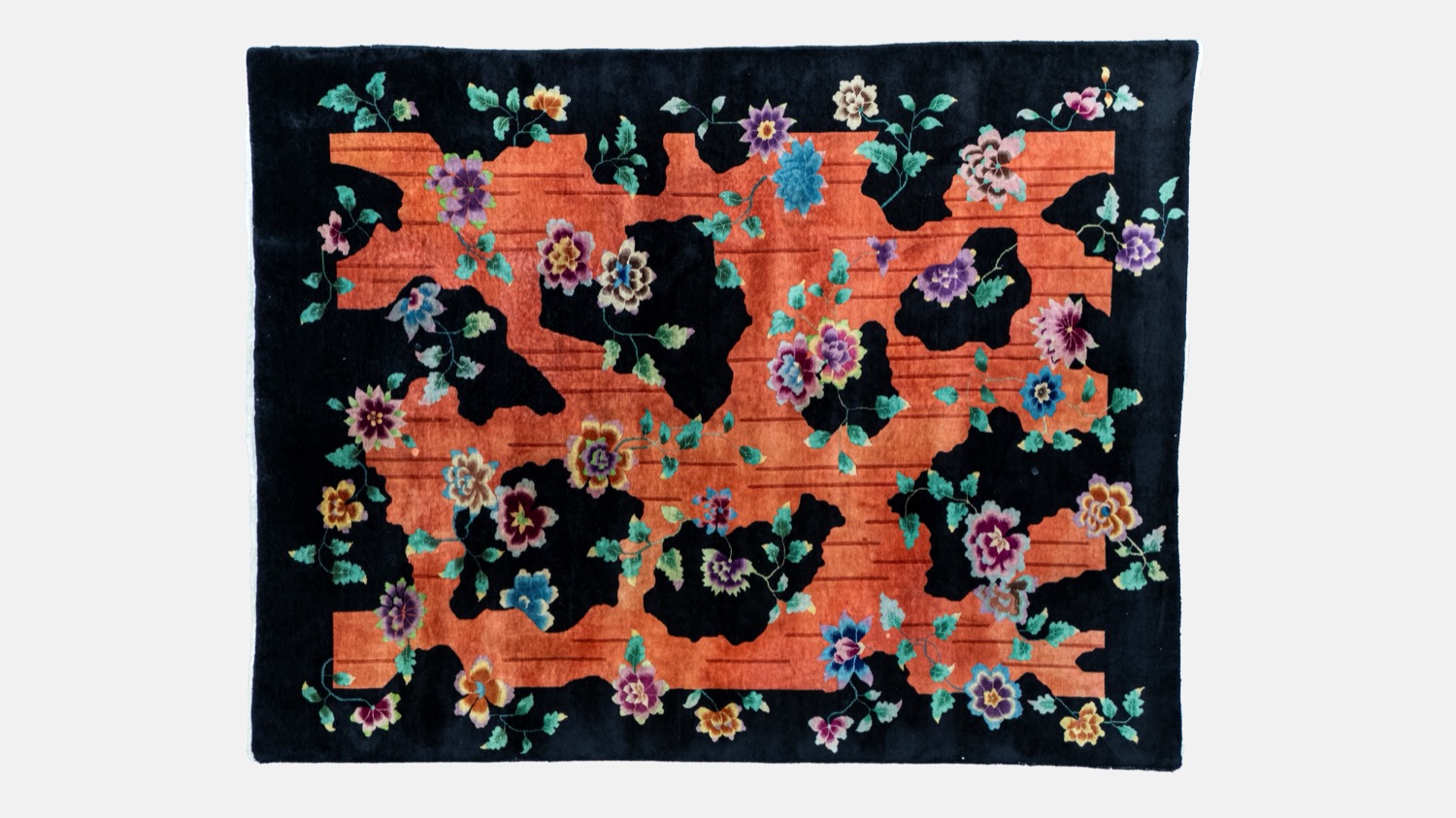 Tappeto Decò a fondo nero con fiori policromi e corteccia. Cina, 1940 circa