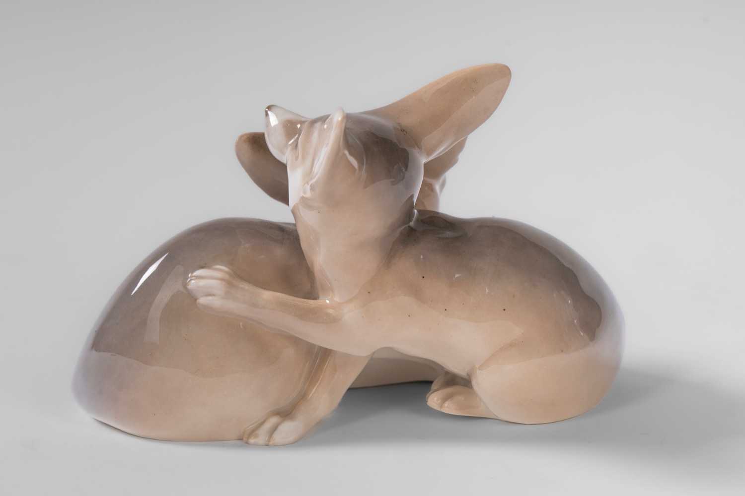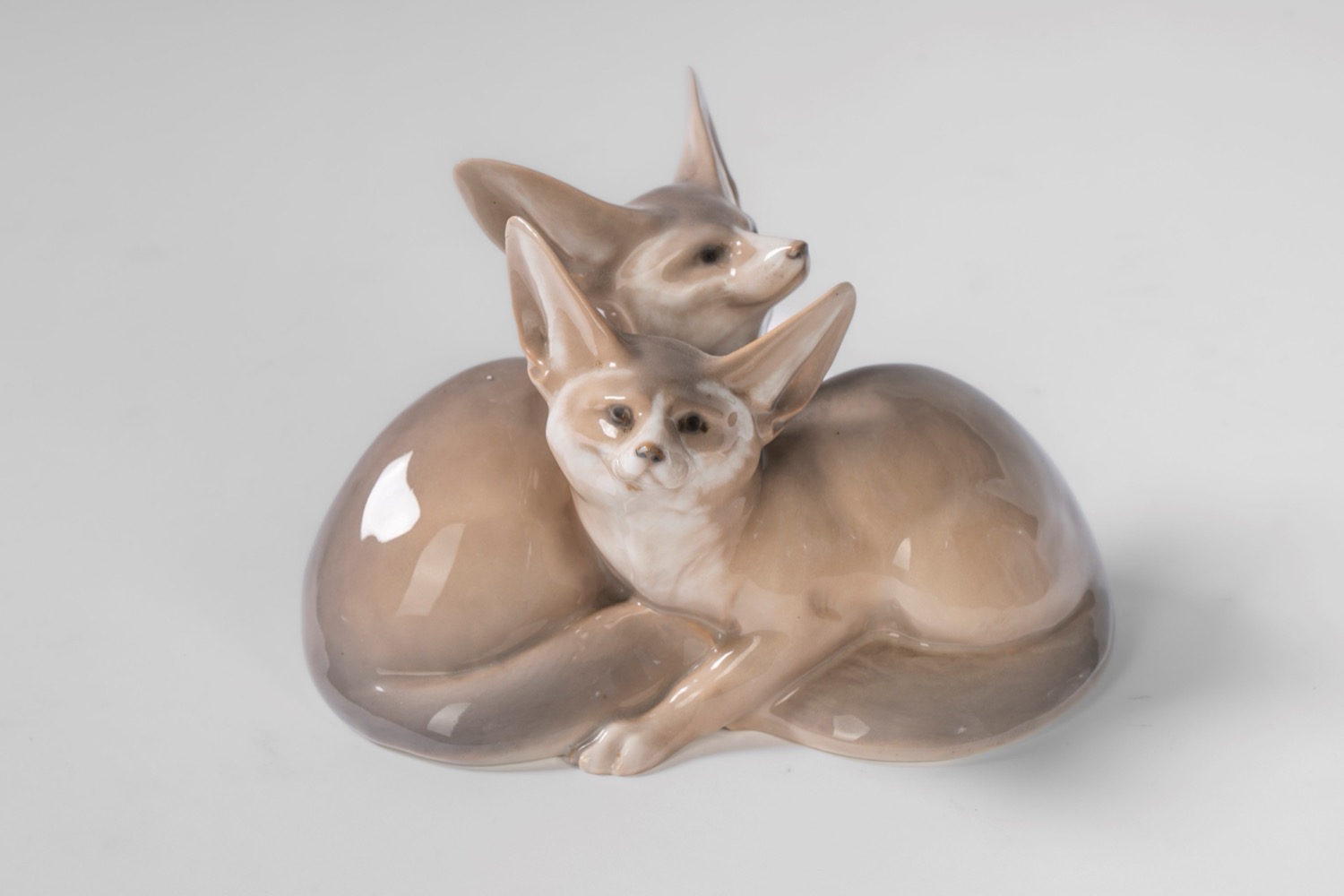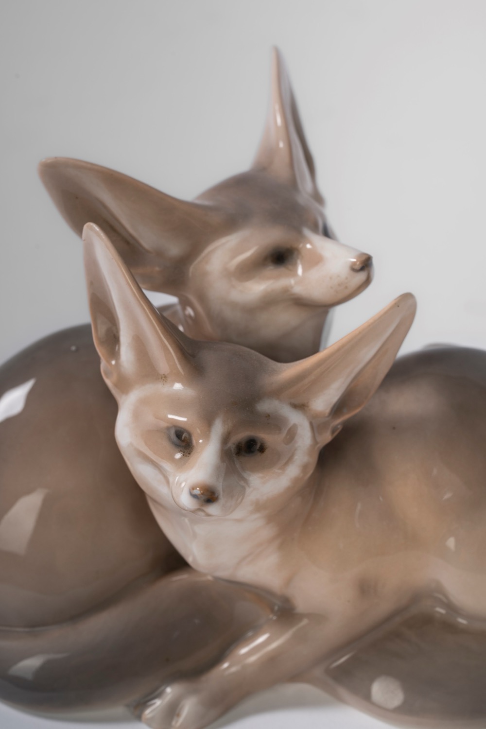 Gruppo raffigurante due volpi del deserto accovacciate in porcellana policroma. Royal Copenhagen, secolo XX