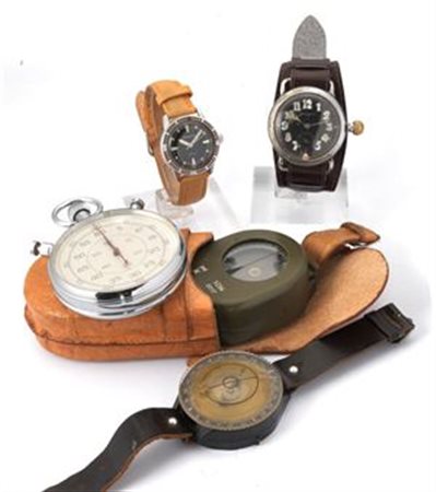 Lotto composto da 2 bussole militari a liquido anni 40 e 60, un cronografo militare cecoslovacco in acciaio con doppio pulsante ,un Jaeger Le Coultre solo tempo, un orologio militare modello Voguematic anni 60