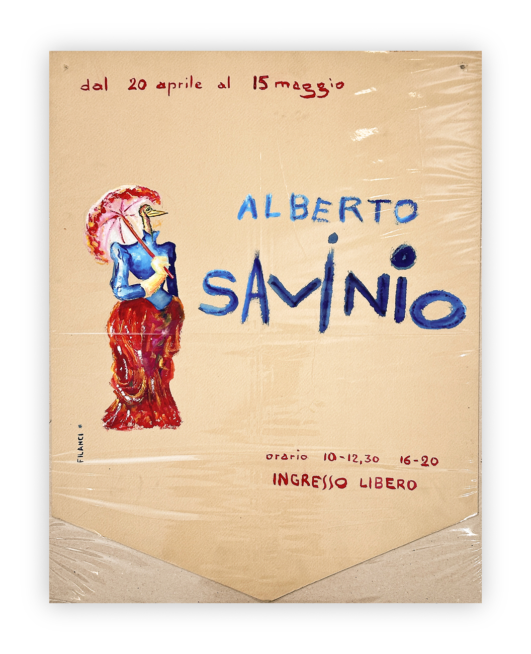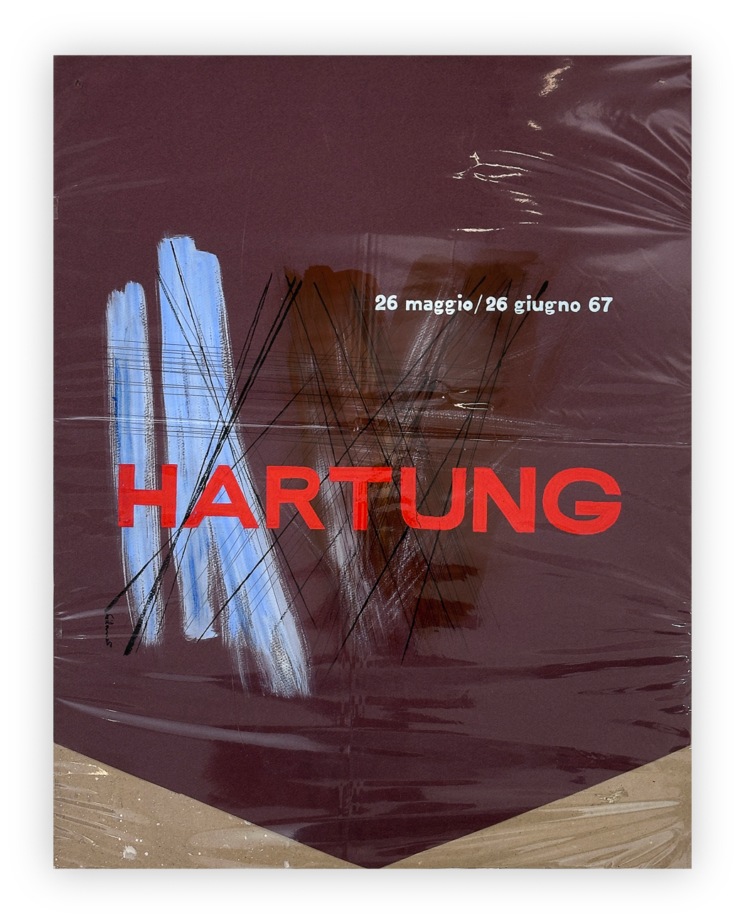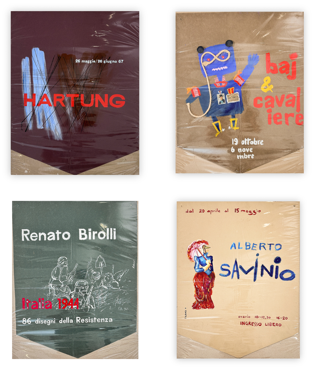 4 locandine dipinte a mano realizzate in occasione delle seguenti esposizioni: Hartung 1967, Alberto Savinio, Enrico Baj & Cavaliere e Renato Birolli