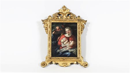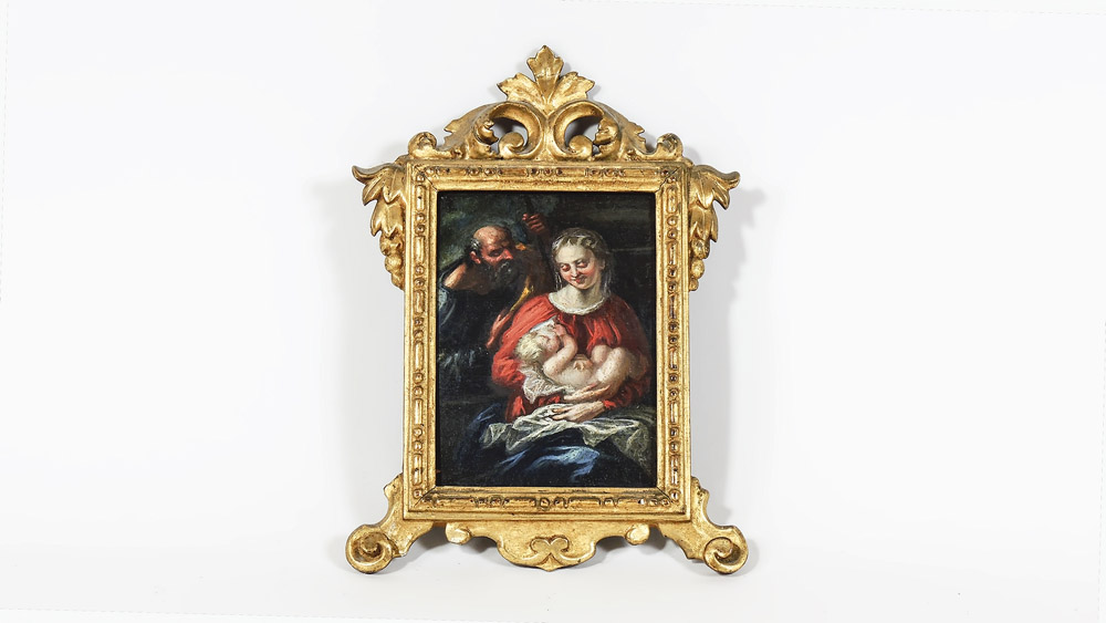 SCUOLA ROMANA DEL XVIII SECOLO Madonna con Bambino e San Giuseppe olio su tavoletta, in cornice in legno intagliato e dorata, lieve difetto cm 14,5x10 ROMAN SCHOOL OF 18TH CENTURY, MADONNA WITH CHILD AND ST. JOSEPH, OIL ON PANEL