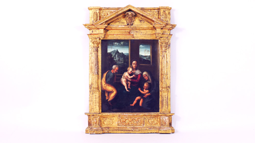 PITTORE OLANDESE ATTIVO IN ITALIA NEL XVII SECOLO Sacra Famiglia con San Giovannino e Sant'Elisabetta olio su tavola, in cornice coeva in legno intagliato e dorato a tabernacolo, difetti cm 53,5x42,5 DUTCH PAINTER ACTIV IN ITALY IN 17TH CENTURY, SACRED FAMILY WITH ST. JOHN AND ST. ELIZABETH, OIL ON PANEL