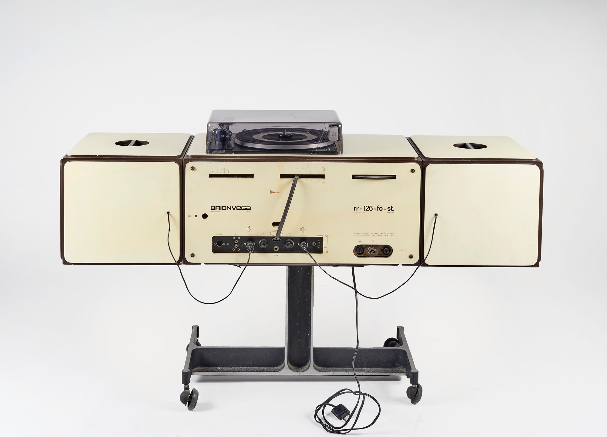 ACHILLE & PIER GIACOMO CASTIGLIONI Radiofonografo giradischi mod. "RR126 fo-st". Corpo in legno bianco su base in alluminio dotata di ruote. Sopra monta un giradischi Dual. Prod, Brionvega, Italia, c. 1965. Cm 74x120x37. (difetti)