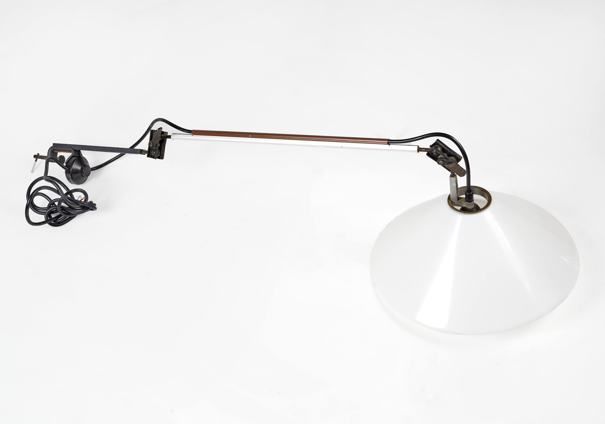 ENZO MARI & GIANCARLO FASSINA Lampada a morsetto in alluminio, acciaio verniciato a polvere e plastica. Prod. Artemide, 1974. Cm 66x38x61.