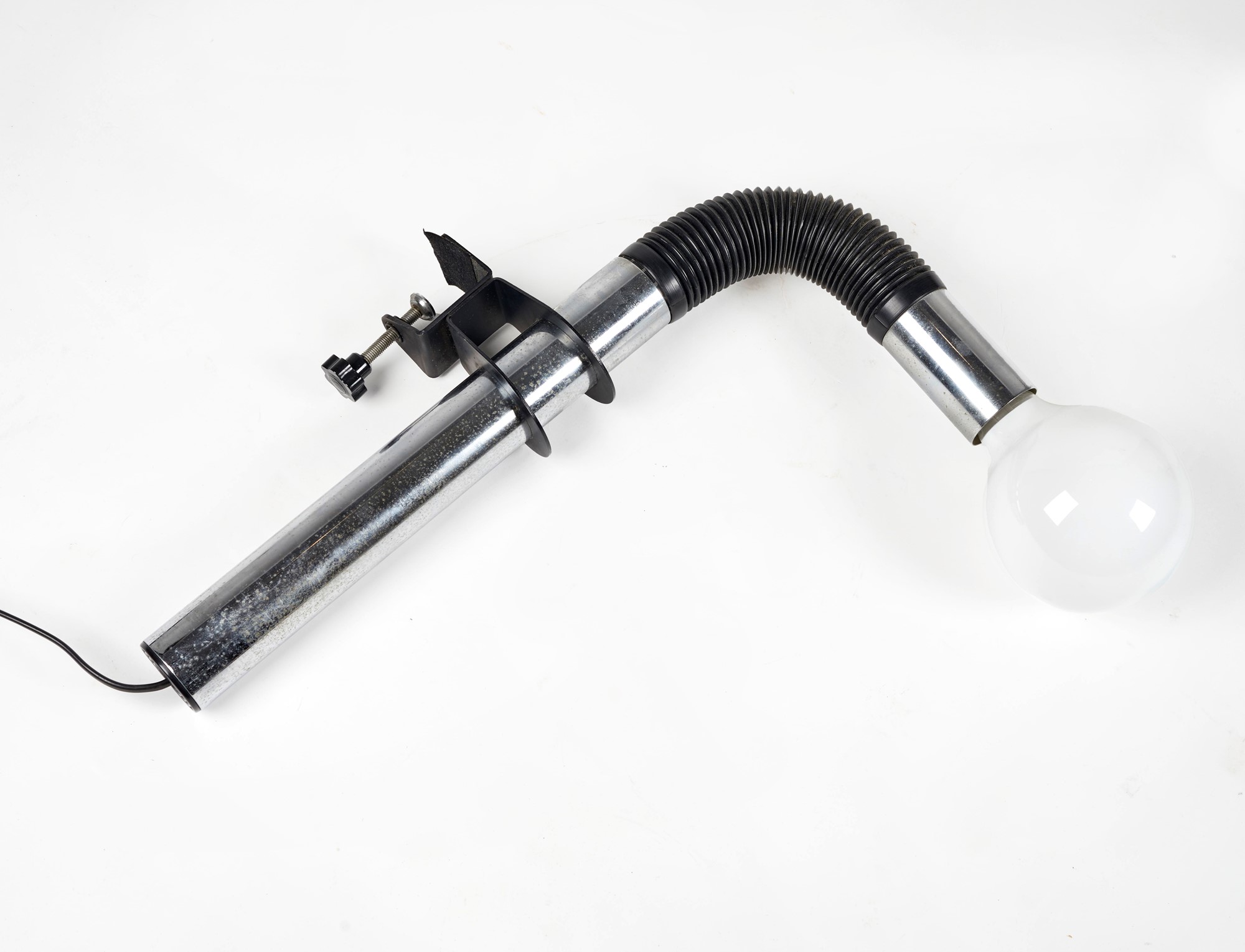TARGETTI Lampada con morsetto modello "Sankey", in metallo cromato e braccio flessibile in plastica. Prod. Targetti, Italia, anni '70. Cm 52x32. (lievi difetti)