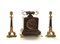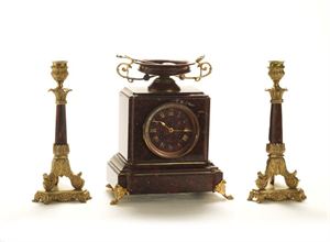 PENDOLA Trittico da camino in marmo rosso e bronzo con candelieri, Francia...