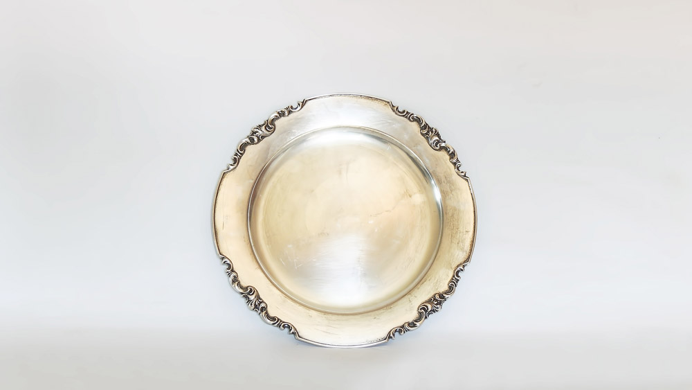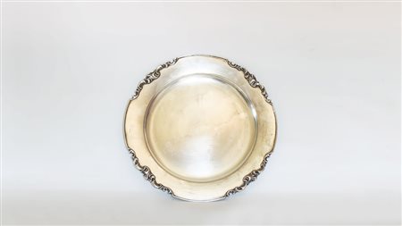 PIATTO ROTONDO IN ARGENTO bordo sbalzato con volute gr 475, diam cm 28 ROUND...