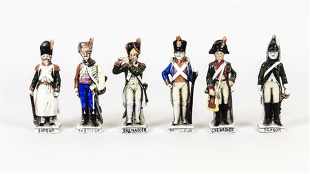 SERIE DI SEI FIGURE IN PORCELLANA POLICROMA Capodimonte, inizio del XX secolo raffiguranti soldatini napoleonici h cm 13 A SET OF SIX PAINTED PORCELAIN FIGURES, CAPODIMONTE, EARLY 20TH CENTURY