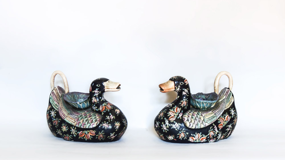 COPPIA DI VERSATOI IN PORCELLANA CINESE modellati come due anatre e dipinti...