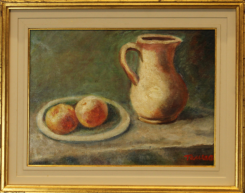 FIORENZO TOMEA, "Natura Morta", 1970 circa, olio su tela, cm 30x40, con cornice cm 41x51x4,5, peso 2 kg, opera con autentica di Camilla Tomea in data Milano, 3 novembre 1981. Al fronte: firma in basso a destra. Al verso: etichetta della Galleria Ledi, Milano con informazioni, vari timbri. Opera pubblicata su BRER ARTE, esposizione 12-16 febbraio a pag 18, n°40. Opera con cornice in omaggio.