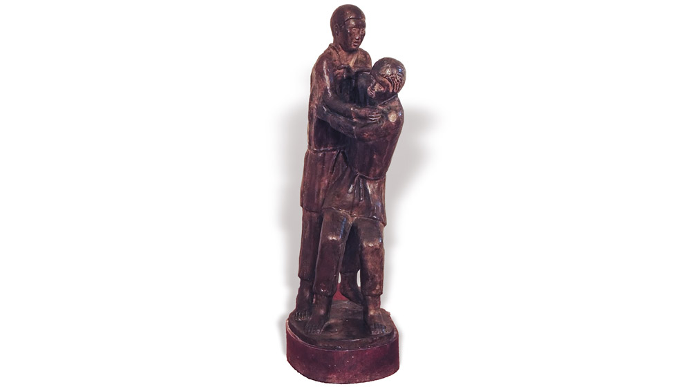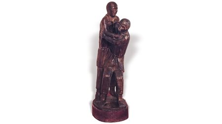 ARMANDO VANNI CORTECCI Ragazzi che giocano gruppo in terracotta rivestita in metallo, su base in legno, firmata esclusa la base h cm 73x31x23 PLAYING BOYS, METAL PLATED TERRACOTTA FIGURAL GROUP