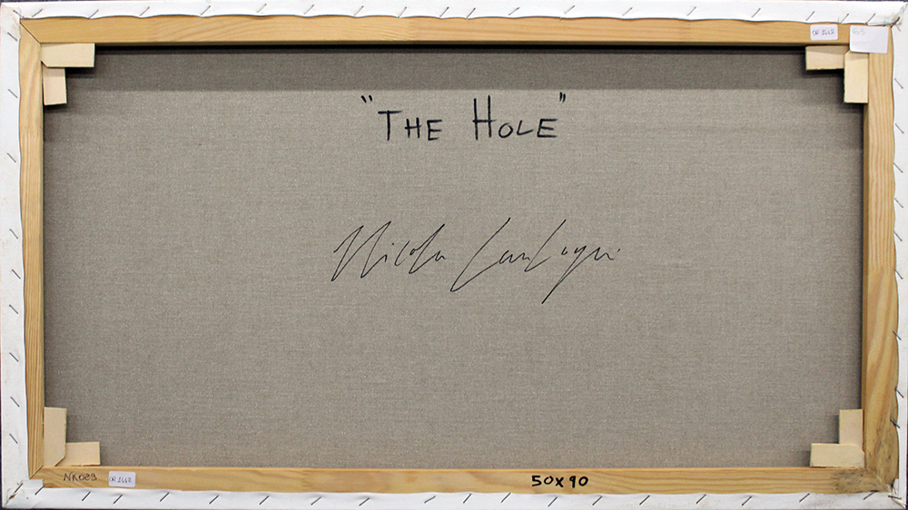 NICOLA CANCOGNI, "The Hole", olio su tela, dim 50x90. Al fronte: firma in basso al centro "Niko". Al verso: titolo e firma al centro.