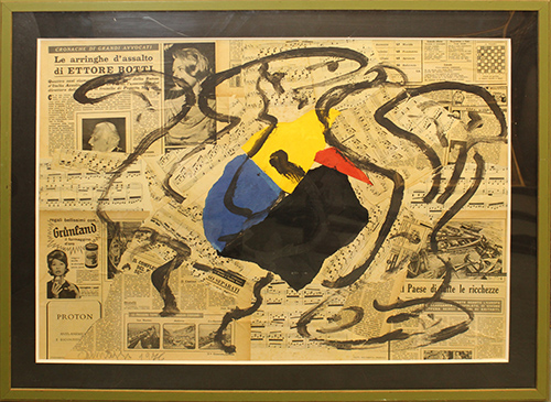 ARTURO CARMASSI, 1976, tecnica mista su fogli di giornale e spartiti musicali, dim. 50x70, con cornice 63x83x3 cm, 2 kg, opera con autentica su foto dell'artista. Al fronte: firma e anno in basso a sinistra. Opera con cornice in omaggio.
