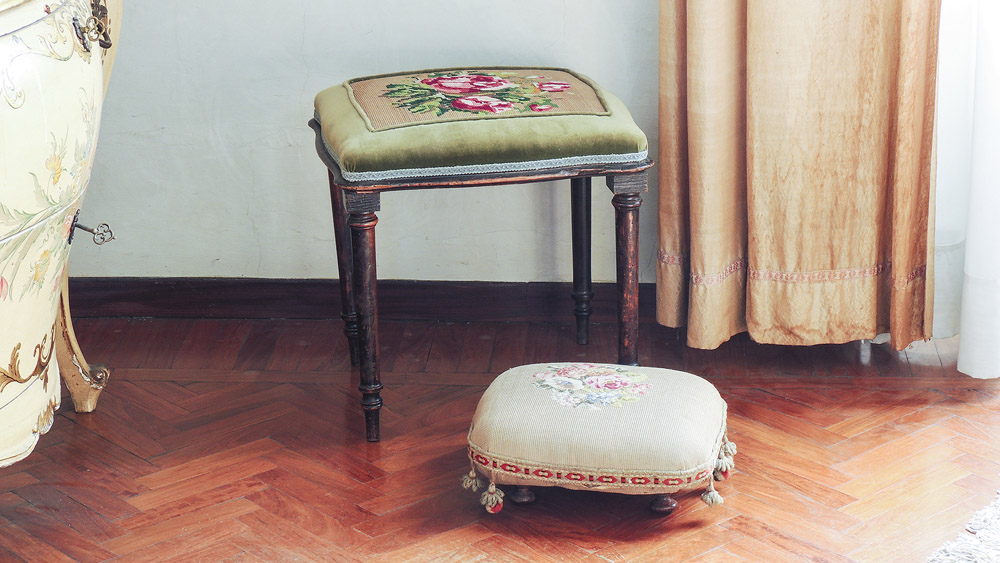 SGABELLO E POGGIAPIEDI entrambi ricamati a piccolo punto h cm 44x45x38, h cm 10x34x30 (2) TWO STOOLS