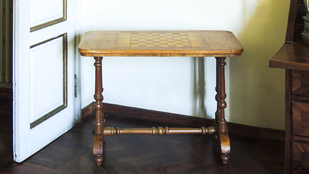 TAVOLINO DA GIOCO IMPIALLACCIATO IN CILIEGIO fine del XIX secolo piano intarsiato con scacchiera e back-gammon in legni di frutto, due sostegni torniti riuniti da traversa, piedi a trottola h cm 68x86x45 CHERRYWOOD VENEERED GAMING TABLE, LATE 19TH CENTURY