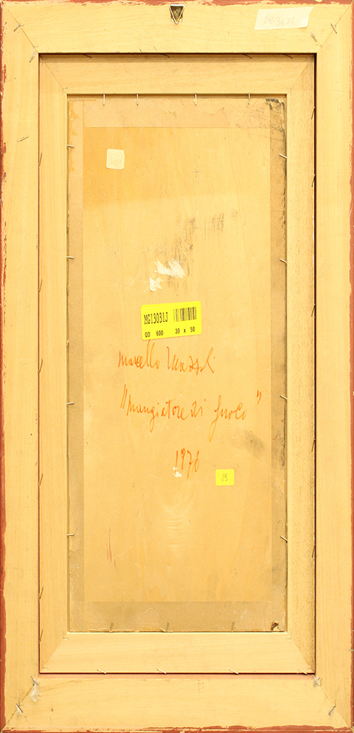 M. MAZZOLI, "Il mangiatore di fuoco", 1976, olio su tavola, cm 50x30, con cornice 69x48x5 cm, 2 kg. Al fronte: firma e anno in basso a destra. Al verso: titolo, firma e anno. Opera con certificato di provenienza della Daliano Ribani Arte. Opera con cornice.
