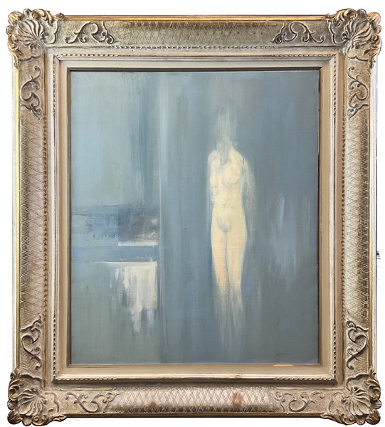 Giuseppe Ajmone "Nudo e ambiente" 1972 olio su tela cm 65x54 firmato in basso a