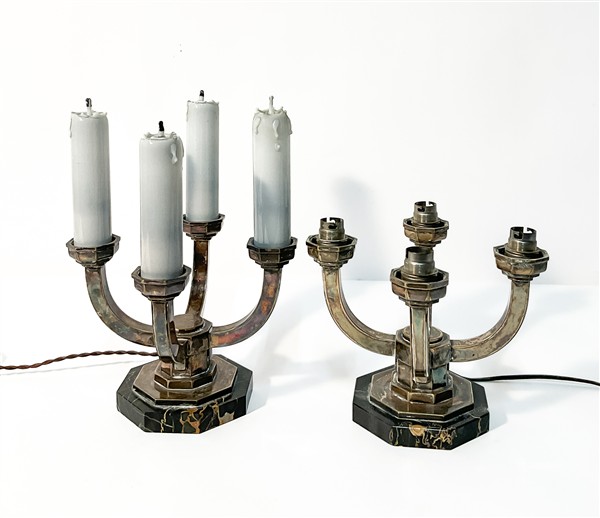 Coppia di candelabri Art Déco a quattro luci montati a lampada in ottone argentato con base in marmo nero. Francia, 1925ca. (cm 17,5x21,5x17,5) (lievi difetti)