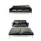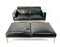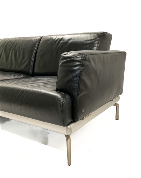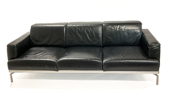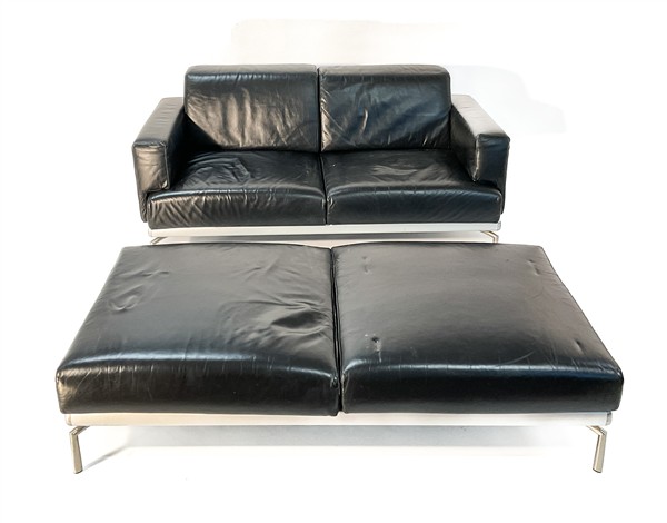 Lotto composto da un divano a tre posti e uno a due posti, e da una panca imbottiti e rivestiti in pelle nera, struttura in metallo. Italia, anni '80. (difetti)