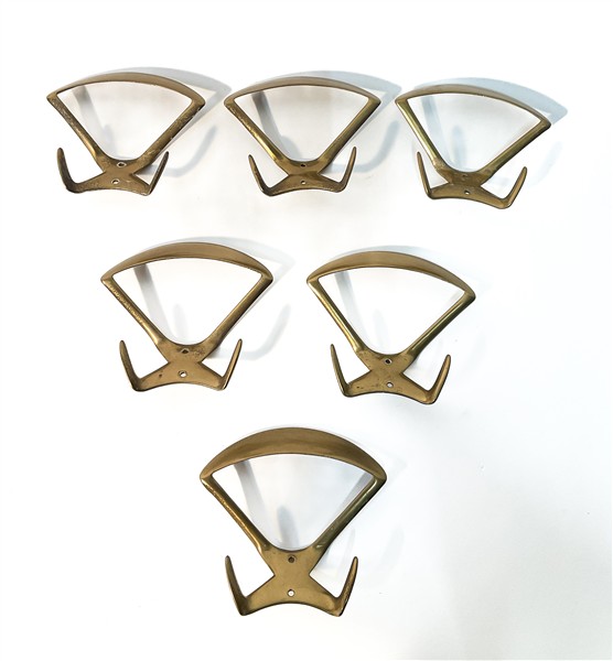 Lotto di sei appendiabiti da parete in fusione di ottone. Italia, anni '50. (di