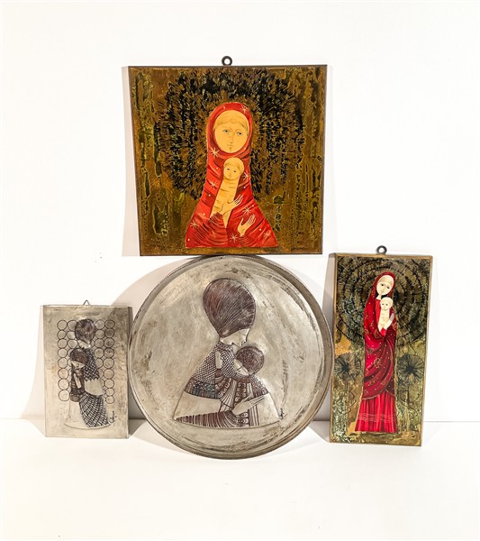 Lotto composto da due Madonne di Valenti e due di Callegaro in lamina metallica battuta e lavorata. Italia, anni '70.