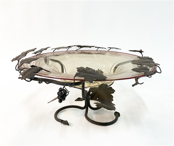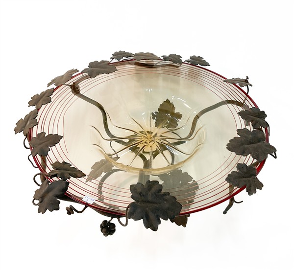 Piatto in vetro soffiato pagliesco con filamenti di vetro rosso applicati a caldo sorretto da alzata in ferro forgiato a foglie di vite. Secolo XX. (h cm 20; d cm 47) (difetti)