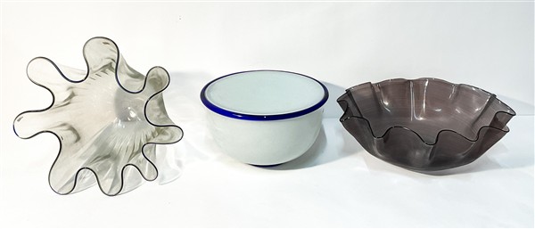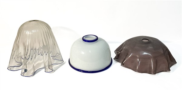 Lotto di tre paralumi: uno modello "Zaccaria" di Ettore Sottsass per Vistosi in vetro incamiciato lattimo bordato in vetro blu; unito a due probabilmente della stessa manifattura: uno in vetro soffiato incolore a mezza filigrana ametista, e uno a fazzoletto in vetro costolato incolore bordato in vetro blu trasparente. Anni '70.