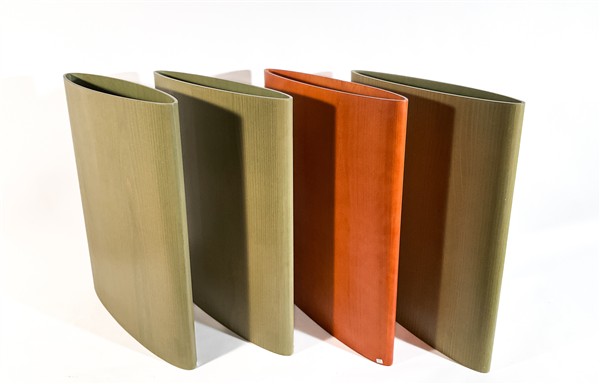 Lotto composto da quattro contenitori a sezione ellissoidale in multistrato di betulla curvato tinto verde chiaro e ciliegio. Produzione DMK, Milano, anni '80. Recanti etichetta. (cm 60x70,5x12)