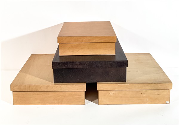 Lotto composto da quattro diverse scatole parallelepipede con coperchio in multistrato di betulla. Produzione DMK, Milano, anni '80. Alcune recanti etichetta. (cm max 44,5x14x44,5) (lievi difetti)
