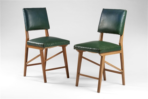 Coppia di sedie in legno chiaro massello e simil pelle verde. Italia, anni '50/'60. (difetti)