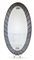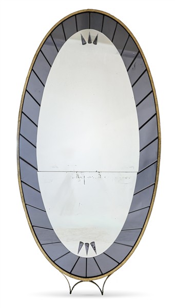 Grande specchiera ovale con cornice in cristalli molati e specchiati blu fumé, profili e sostegno di base in alluminio ottonato. Torino, anni '70/'80. (cm 112x222) (difetti e mancanze)