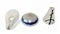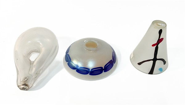 Lotto composto da un pendente in vetro soffiato incolore fortemente iridato di Vinicio Vianello; una parte di lampada in vetro soffiato acidato con macchie informali in vetro ametista scuro, rosso e celeste; e un paralume in vetro opalescente e blu fortemente iridato della manifattura Loetz. (difetti)