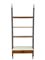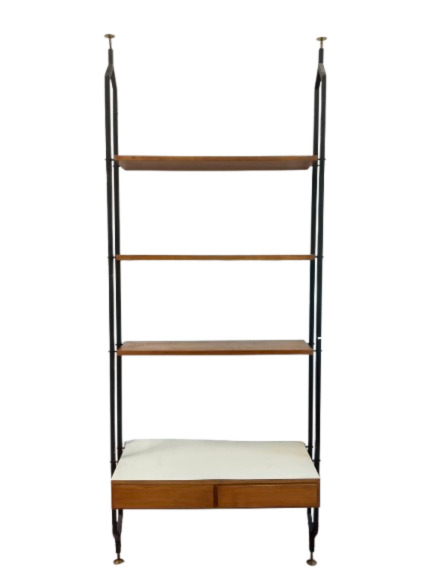 Mobile contenitore/libreria con due stipi ad ante scorrevoli in legno impiallacciato e laminato bianco. Struttura a puntone in metallo verniciato nero e ottone. Italia, 1964ca. (difetti)