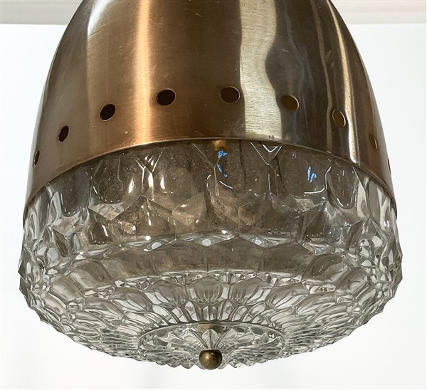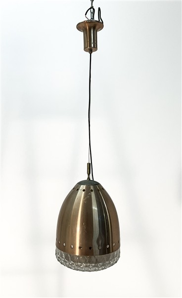 Lampada a sospensione con calotta e attacco in alluminio satinato e diffusore in vetro soffiato in stampo incolore. Italia, anni '60/'70. (h cm 100; d cm 25) (lievi difetti)