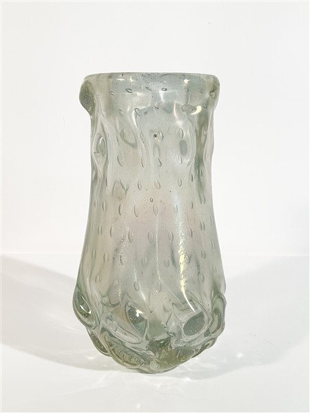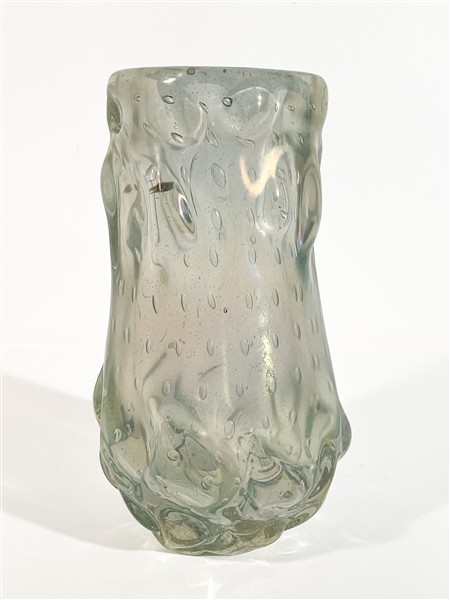 Vaso in vetro soffiato incolore fortemente iridato con inclusione di bolle regolarmente disposte. Murano, anni '50. (h cm 26)