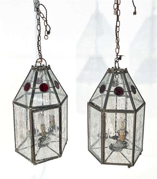Coppia di lanterne in metallo e vetro incolore sabbiato e rosso trasparente. Prima metà secolo XX. (cm 27x56x27) (difetti)