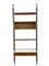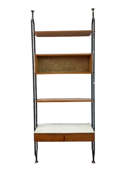 Mobile contenitore/libreria con due ripiani, uno stipo a giorno e un piano con due cassetti nella fascia in legno impiallacciato e laminato bianco. Struttura a puntone in metallo verniciato nero e ottone. Italia, 1964ca. (difetti)